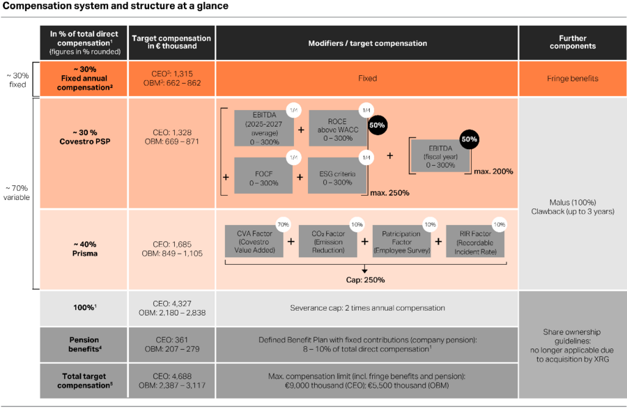 The following section reports the compensation of the Board of Management of Covestro AG for fiscal 2025. The members of the Board of Management of Covestro AG are the same as the members of the Board of Management of Covestro Deutschland AG, which is a wholly owned subsidiary of Covestro AG. Compensation is not paid for the members’ work on the Board of Management of Covestro Deutschland AG.