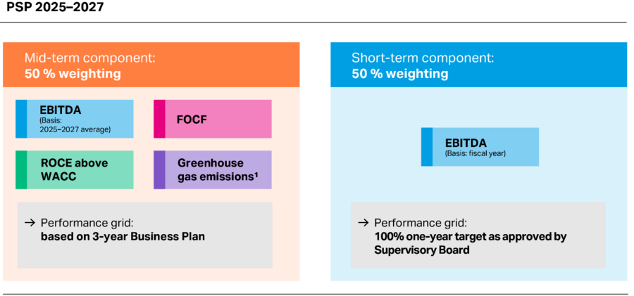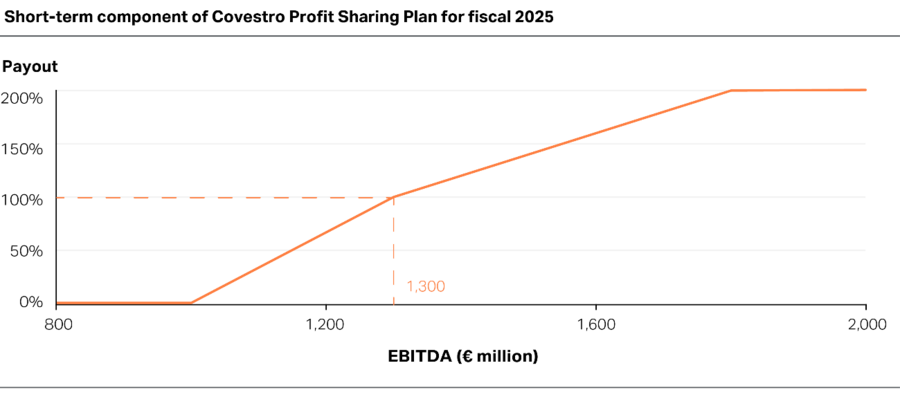 The Covestro Profit Sharing Plan (Covestro PSP) has been expanded, effective from fiscal 2025. In addition to the four performance metrics already used, for which the targets are derived from the medium-term planning for the years 2025 to 2027, a short-term component has been defined. This is based on the EBITDA target of a single fiscal year and is specified for the subsequent year by the Supervisory Board on the basis of the forecast made in the fourth quarter. For the purpose of calculating the total payout, the medium- and short-term components are each weighted at 50%.