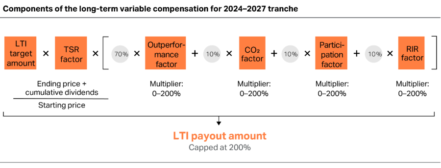 Various factors are calculated to determine the payout; their values are based on target attainments for the respective metrics: the TSR factor and the outperformance factor (before fiscal 2025), the CVA factor (from fiscal 2025 onward) as well as elements of the sustainability component (the CO2 factor, the participation factor, and the RIR factor). They are explained in detail below.