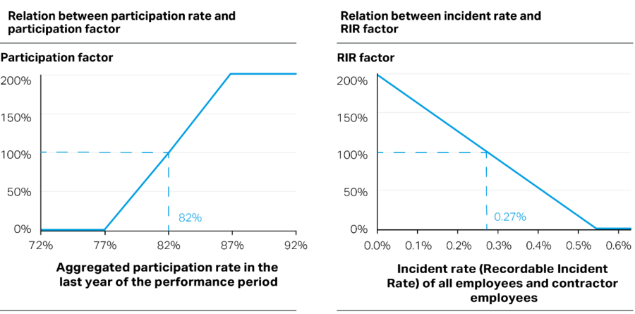 The two sustainability criteria relating to the “Social” aspect, the participation rate for the regularly held employee survey and the recordable incident rate (RIR), will only be reflected in the payouts from the 2024–2027 and 2025–2028 Prisma tranches, which will be determined in the years 2027 and 2028. Since the current status of these metrics does not permit any forecast for the year 2027 or 2028, both payout factors for calculating fair value are set to 100%.