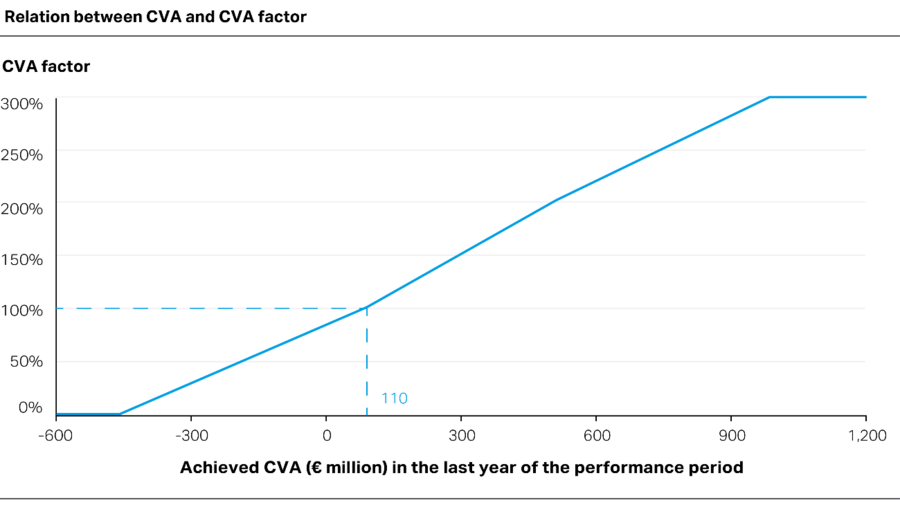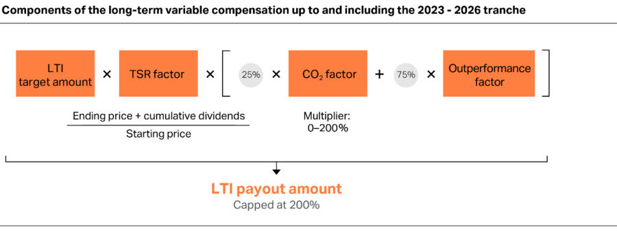 For each individual performance indicator, the payout can be between 0% (failure to meet minimum requirements) and 300%. The total payout from the medium-term component is the arithmetic mean of the individual payouts for all four components. However, it is limited to 250% of the target value. This means that, if the cost of capital is not earned in a given fiscal year (ROCE above WACC < 0), no payout is made at all from the medium-term component, irrespective of the results achieved for the other metrics.