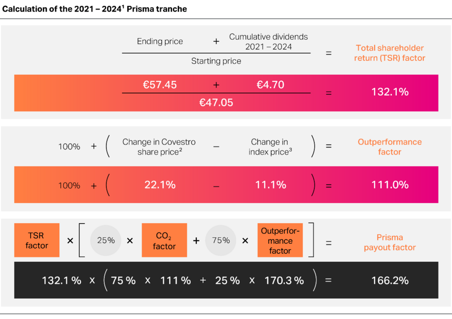 The TSR factor is the return generated by a share expressed as a percentage (total of the final price of the Covestro share and all dividends distributed per share during the four-year performance period divided by the initial price).