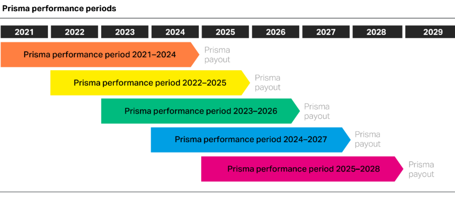 A new Prisma tranche with a four-year performance period is issued for each fiscal year. Prior to the beginning of this performance period, the Supervisory Board stipulates the performance criteria for the financial and sustainability metrics as well as the relative weighting of these criteria.