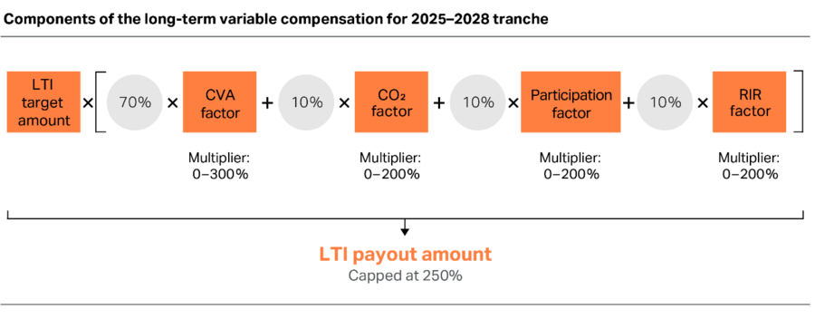 Up to and including the 2024–2027 tranche, the Prisma share-based compensation program for long-term variable compensation (long-term incentive, LTI) took into account the performance of Covestro shares, including dividends (total shareholder return) and outperformance against the STOXX Europe 600 Chemicals index* over a period of four years. As from fiscal 2024, the sustainability component, which has included a CO2 factor since its inception and has been part of the LTI plan since the year 2021, was expanded by adding two metrics from the ESG “Social” aspect. Against the backdrop of the voluntary public takeover offer by ADNOC International Germany Holding AG, Munich (Germany), the share price, and therefore also total shareholder return and outperformance, no longer seemed suitable metrics for long-term compensation. For this reason, the share-based portion of long-term compensation was replaced by economic value added as a metric from 2025 onward. The sustainability component with its three parts (GHG emissions, participation rate, and recordable incident rate) will be retained unchanged.