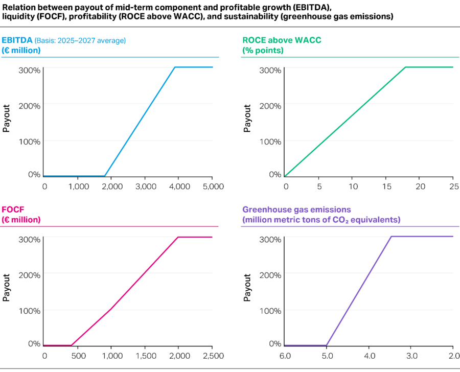 The thresholds of the three financial indicators for the medium-term component were missed in the 2025 reporting year. On the basis of the value achieved for GHG emissions (4.3 million metric tons of CO2 equivalents), a payout percentage of 140% would have been calculated for this component. Since the capital costs were not earned in the reporting year (ROCE above WACC < 0), the plan terms and conditions stipulate that no payout will be made from the medium-term component.