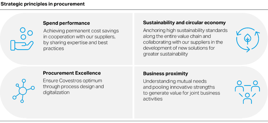 In a process aimed at creating a competitive advantage for Covestro and making a decisive contribution to overall value, Group Procurement has defined the strategic principles (cost optimization, excellence in procurement, sustainability, circular economy, and business proximity). Group Procurement contributes to realizing Covestro’s vision of becoming fully circular by, among other things, purchasing renewable energy and alternative raw materials.