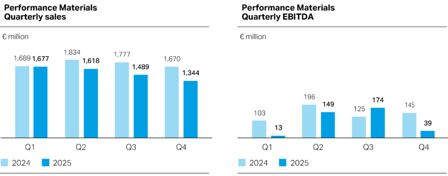 Sales in the Performance Materials segment were down 12.1% to €6,128 million in fiscal 2025 (previous year: €6,970 million). The drop was primarily driven by a 6.7% decline in average selling prices due to oversupply in the market, which coincided with lower raw material prices being passed on to customers. In addition, a 2.9% decline in volumes sold as well as adverse changes in exchange rates of 2.5% had a negative effect on sales.