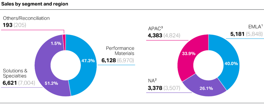 Sales were 11.4% lower, at €5,181⁠ ⁠million (previous year: €5,848⁠ ⁠million), in the EMLA region and 3.7% down, at €3,378⁠ ⁠million (previous year: €3,507⁠ ⁠million), in the NA region. Sales in the APAC region were down by 9.1% to €4,383⁠ ⁠million (previous year: €4,824⁠ ⁠million).