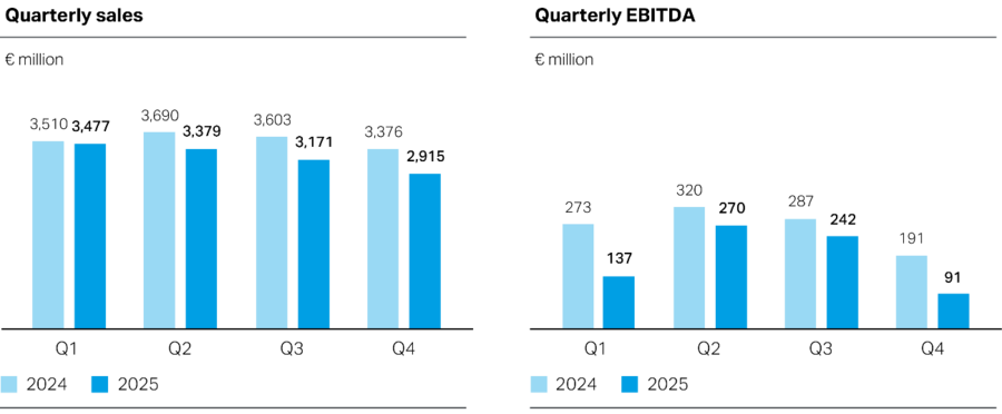 Group sales declined by 8.7% in fiscal⁠ ⁠2025, to €12,942⁠ ⁠million (previous year: €14,179⁠ ⁠million). The decrease in sales was primarily attributable to a drop in the selling price level in all regions, which had a diminishing effect on sales of 5.2%. Furthermore, exchange rate movements had a decreasing effect on sales of 2.6%, while lower volumes sold also had an adverse impact of 0.9% on sales.