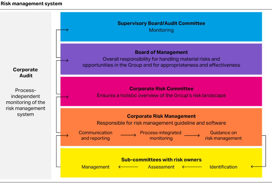 The effectiveness of the above management systems is evaluated at regular intervals by the Corporate Audit function, which performs an independent and objective audit focused on verifying compliance with laws and policies. In October 2025, the Risk Management department was organizationally integrated into the Corporate Audit function. This allows synergies to be used as part of existing possibilities and in accordance with the Three Lines Model of the Institute of Internal Auditors (IIA). Functionally, the Risk Management department continues to report to the Chief Financial Officer within the Corporate Risk Committee. Corporate Audit systematically evaluates the efficiency and effectiveness of governance, risk management, and control processes in the company and helps to improve them. This includes internal monitoring of the appropriateness and effectiveness of the internal control system and the risk management system. The selection of audit targets follows a risk-based approach. Corporate Audit performs its duties according to internationally recognized standards. The Supervisory Board’s Audit Committee is regularly informed about the results of audits and also receives an annual report on the internal control system and its effectiveness.