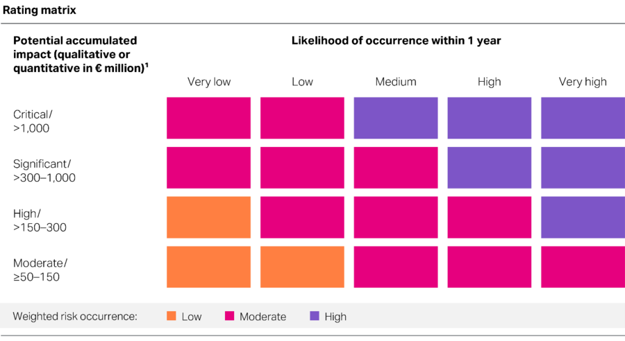 »ESRS 2.53 (e) Risks are evaluated using estimates of the potential impact after taking into account countermeasures and the likelihood of their occurrence. The potential economic losses are projected using the expected EBITDA loss and, in some individual cases, the FOCF loss. If the financial impact cannot be estimated, a qualitative assessment is made of the extent of the damage on the basis of criteria such as strategic effect, influence on our reputation, or possible loss of confidence among groups of stakeholders. Opportunities are currently assessed qualitatively, because they are not limited only to direct financial planning metrics, but also reflect the growing importance of innovation, sustainability, and long-term value creation. All material opportunities and risks as well as the respective (counter)measures are documented and regularly updated in the risk management software, which is used throughout the Group. The risk management system is reviewed regularly by Corporate Risk Management over the course of one year. Significant changes are promptly entered in the software and reported to the Board of Management. In addition, a report on the risk portfolio is submitted to the Audit Committee several times a year and to the Supervisory Board at least once a year.«