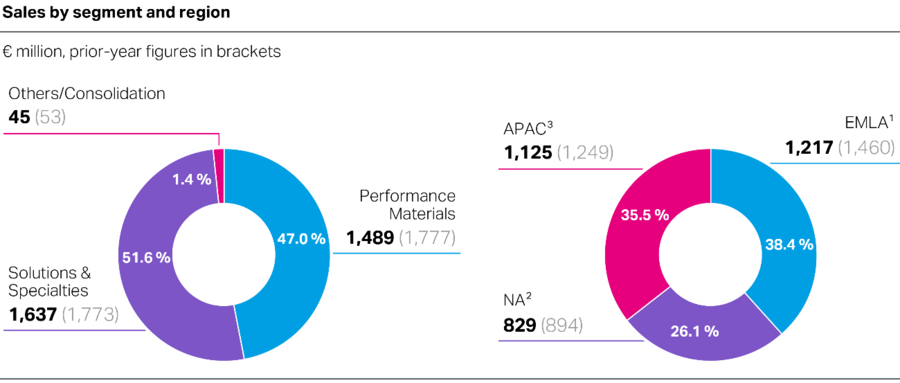 In the third quarter of 2025, sales decreased by 16.2% to €1,489 million (previous year: €1,777 million) in the Performance Materials segment and by 7.7% to €1,637 million (previous year: €1,773 million) in the Solutions & Specialties segment.